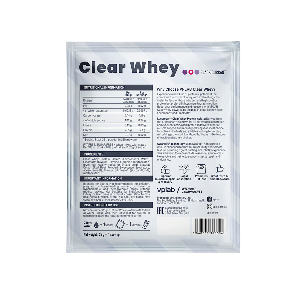 VPLab's CLEAR WHEY is a cutting-edge protein drink designed for athletes and active individuals who want high-quality protein without the heaviness of traditional shakes. Powered by premium Lacprodan® Clear Whey Isolate and enhanced with ClearSoft™ technology, it delivers superior solubility, rapid absorption, and a light, refreshing taste—perfect for daily use to support lean muscle growth and recovery.