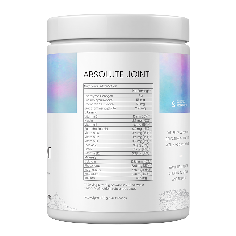 Absolute Joint ist vollgepackt mit gelenkfreundlichen Inhaltsstoffen, die Ihnen helfen können, fit, aktiv und gesund zu bleiben. Unsere einzigartige Formel enthält bioaktives Kollagen, Glucosamin, Chondroitin und Hyaluronsäure sowie 14 wichtige Vitamine und Mineralstoffe. In Kombination unterstützen sie die Spitzenleistung des Bewegungsapparats.