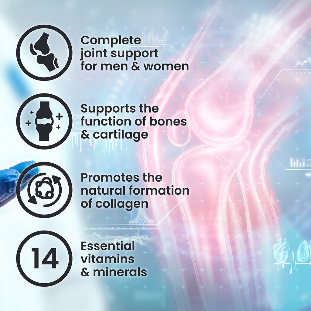 Unsere einzigartige Formel bietet Ihnen eine fortschrittliche Unterstützung der Gelenke, indem sie die Gesundheit und Funktion von Knochen, Knorpeln und Muskeln fördert, damit Sie ein aktives Leben führen können, das Sie lieben.