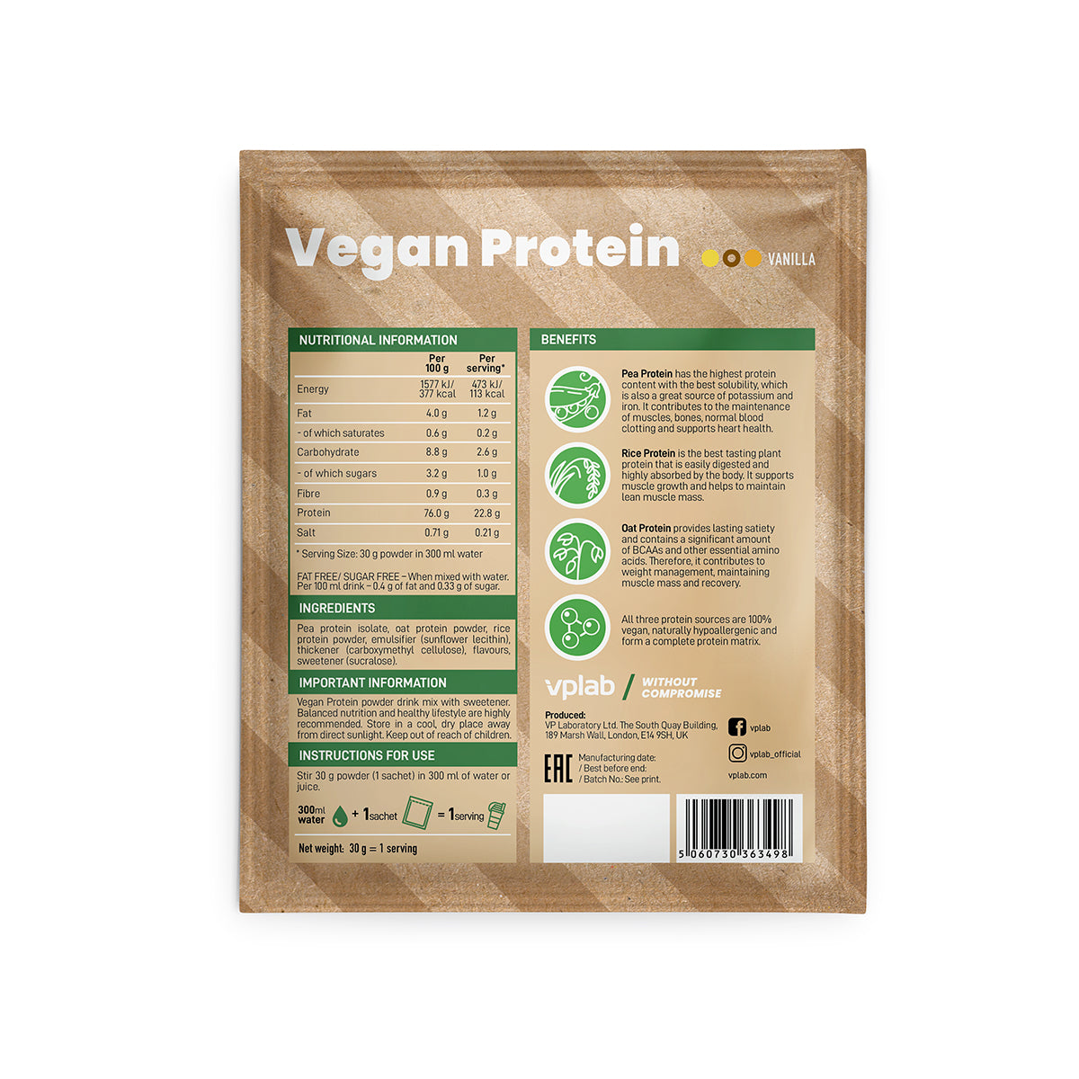 Las tres fuentes de proteínas son 100% veganas, naturalmente hipoalergénicas y forman una matriz proteica completa.