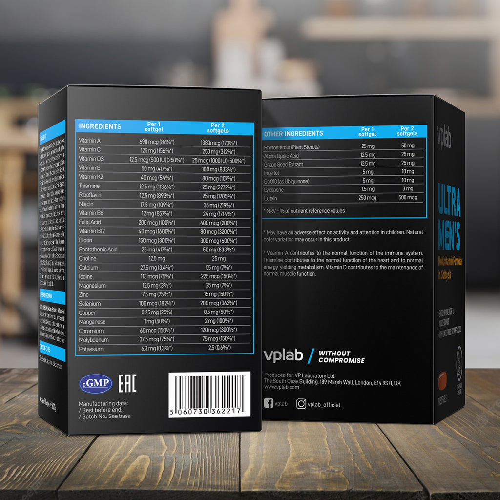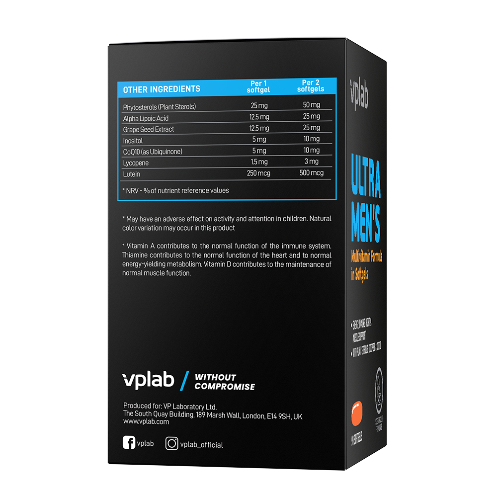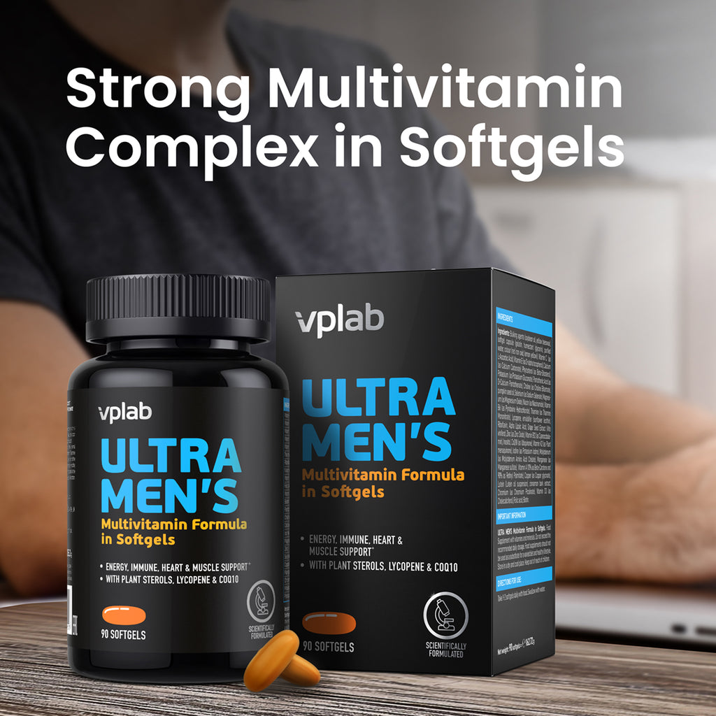 Vplab's Ultra Men’s Multivitamin Formula in Softgels is expertly crafted to support men's health, performance, and vitality. This comprehensive formula provides a unique blend of essential vitamins and minerals, tailored to enhance electrolyte balance, muscle function, protein synthesis, and bone health.
