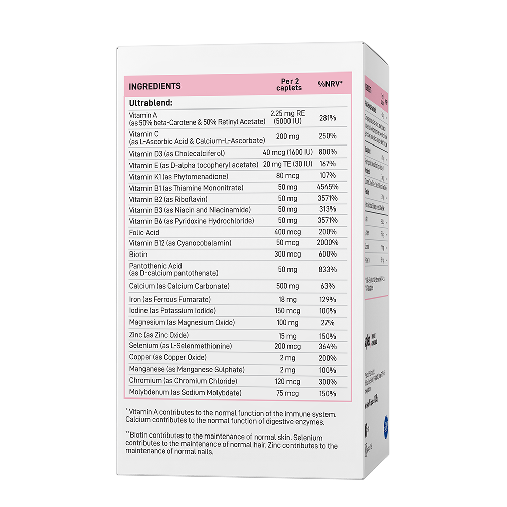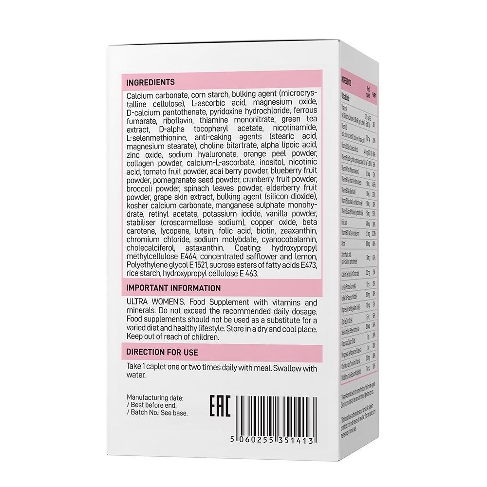 Разработанная для динамичных женщин, ULTRA WOMEN'S укрепляет вашу ежедневную программу здоровья, сочетая в себе нутрикосметику и необходимые витамины, чтобы вы всегда чувствовали и выглядели наилучшим образом. Это идеальный союзник для вашего занятого образа жизни, обеспечивая ваше питание, защиту и энергию.